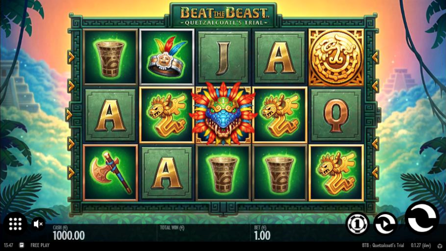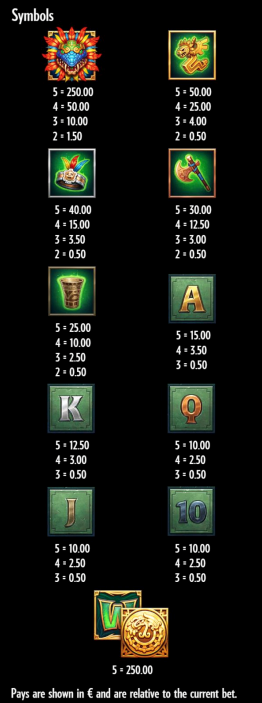 O julgamento de Quetzalcoatl leva você profundamente às florestas do México, aos astecas e suas pirâmides. Onde o ambiente é incrivelmente colorido e tropical. No fundo da máquina caça -níqueis, você pode vislumbrar algumas pirâmides astecas entre a densa floresta. O jogo tem um layout muito bom, onde cada símbolo é cuidadosamente criado com detalhes agradáveis. Enquanto cada símbolo está bem, o símbolo do personagem principal Quetzalcoatl ainda se destaca muito. Onde é exibida uma cobra muito detalhada com cores amarelas, vermelhas e azuis coloridas. Uma vez que os vários símbolos atingem uma linha vencedora, uma cor verde agradável brilha ao seu redor. O jogo oferece música incrível que dá o toque extra mágico. Como os efeitos e a aparência do jogo são tão agradáveis, é uma pena que os botões de rotação e o menu inferior geralmente não cumpram o mesmo padrão. Assim como os astecas deram a seus bons presentes de Deus Quetzalcoatl, este jogo também oferece uma experiência espetacular de jogos ao jogador.